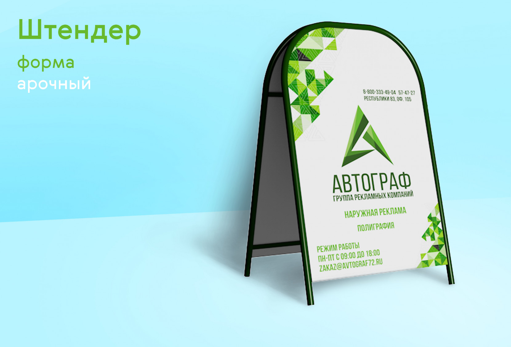 Штендер (рекламный штендер, «А-стойка») — это мобильная и эффективная конструкция для привлечения внимания к акциям, услугам и товарам. Он широко используется в розничной торговле, кафе, салонах красоты, автосервисах и других заведениях для размещения информации перед входом.